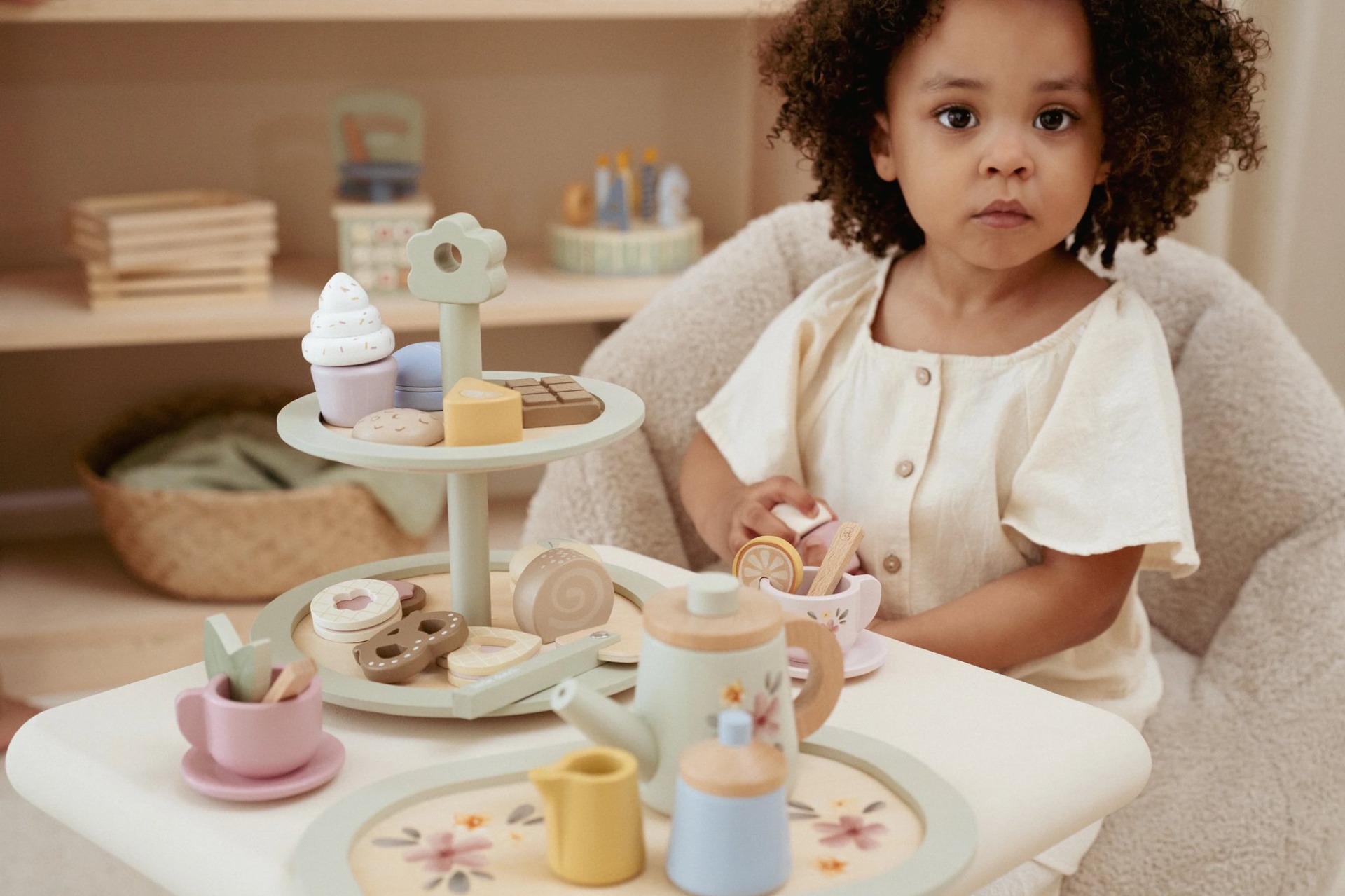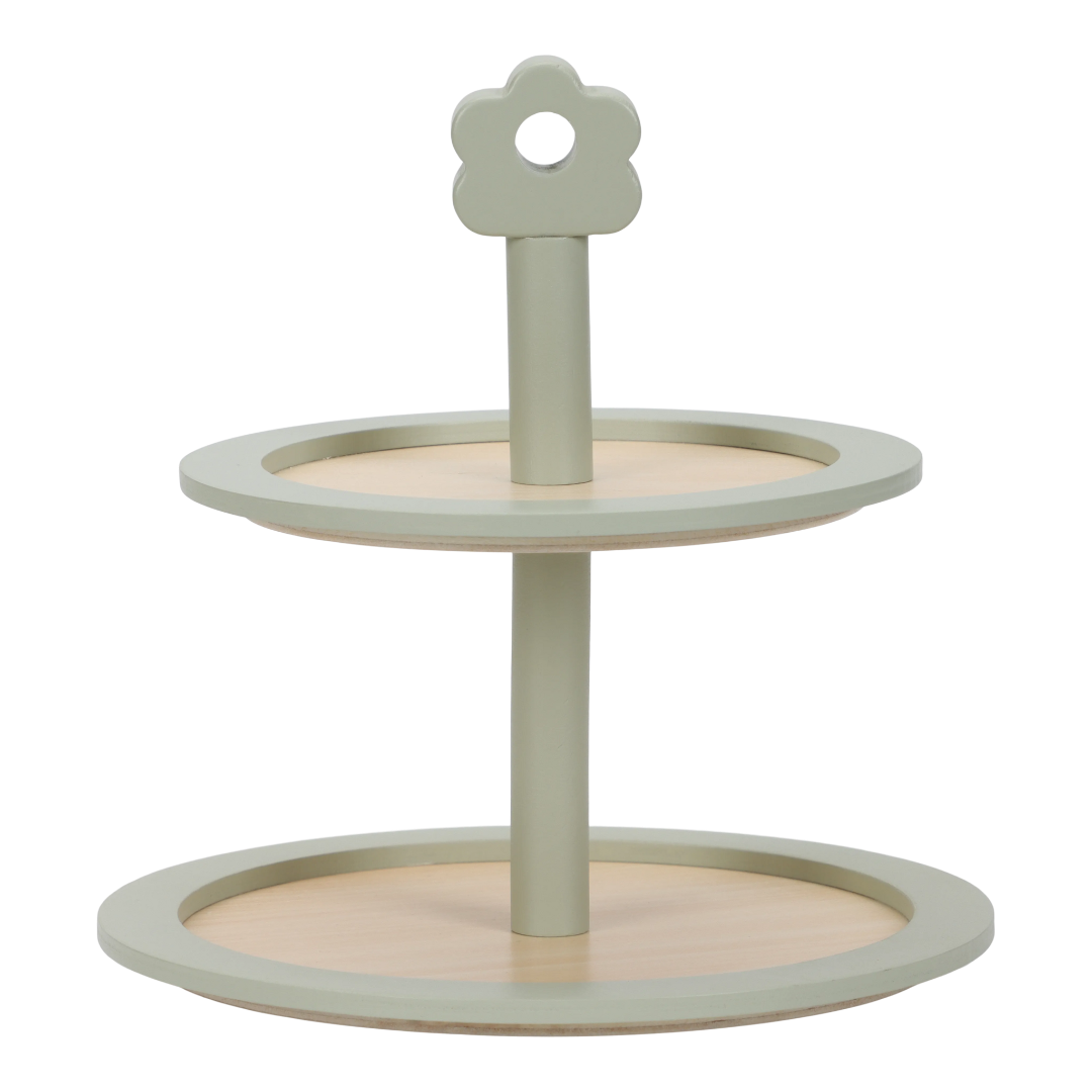 Theetijd! Met deze prachtige houten etagère vol heerlijke gebakjes kunnen kinderen de mooiste high tea serveren. Op de drie lagen vind je een muffin, koekjes en kleurrijke macarons – allemaal even verleidelijk. Gebruik het bijgeleverde taartschepje en het menukaartje met illustraties om de gasten te laten kiezen. Perfect voor fantasierijk speelplezier en gezellige theemomentjes!