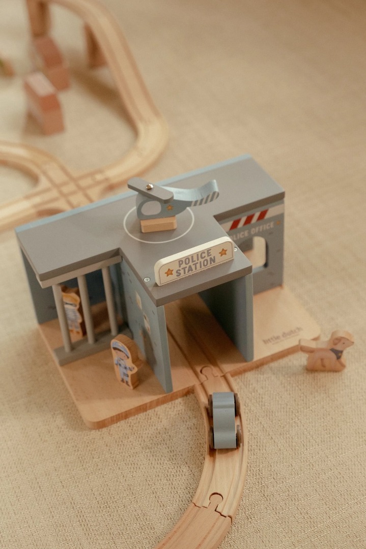 Boef gespot! Dit houten politiebureau bevat alles voor spannende politieverhalen. Met een politieauto, een helikopter, een agent, een boef en zelfs een politiehond! Het bureau heeft een cel met tralies en een landingsplatform. Zet de boef vast en houd de stad veilig. Dit politiebureau speelgoed is een perfecte aanvulling op de houten treinbaan XL en stimuleert fantasierijk spel. Wie neem jij mee naar het bureau?