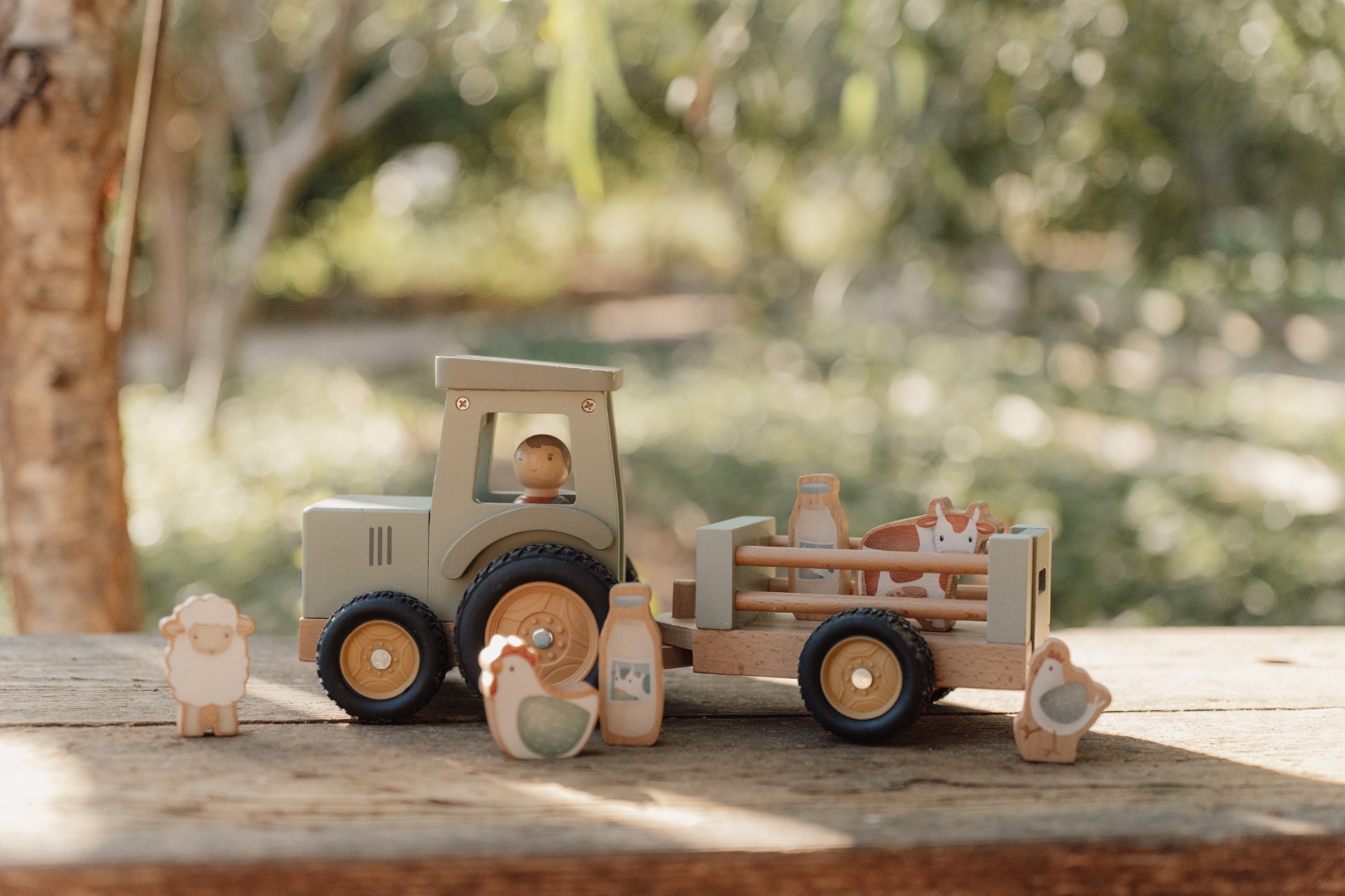 Vroem vroem, hier komt de tractor met alle diertjes aan! Super leuk speelgoed om de fantasie van jouw kleine te stimuleren. Naast de diertjes vind je ook twee melkflessen in de aanhangwagen. Breng alles naar de boerderij en je taak is voldaan. Alles is gemaakt van hout, waardoor het lang mee kan gaan.