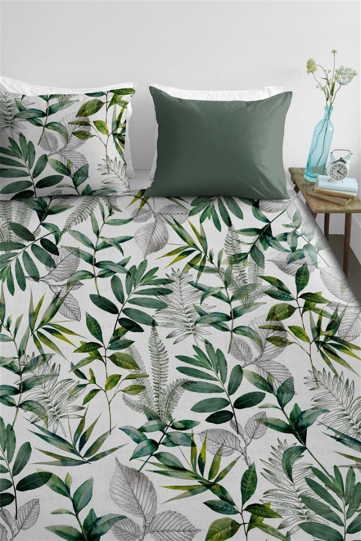 Door het Ambiante Eleni dekbedovertrek verandert je slaapkamer in een botanische tuin. De bladeren lopen gelaagt over elkaar heen waardoor het net lijkt of er diepte in zit. De blaadjes in verschillende tinten groen, komen prachtig tot hun recht tegen de witte achtergrond. Dit maakt het overtrek tot een frisse aanwinst voor je slaapkamer.